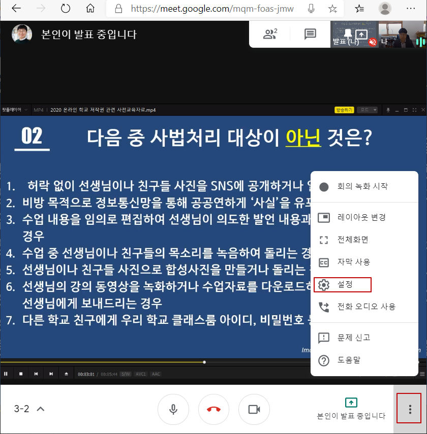 설정은 정말 구글스럽다. 군더더기 없이 간단하고 복잡하지 않아 쉽게 설정할 수 있다. 그럼에도 아쉬운 점이 있다면 조직 내에서 사용할 수 있는 행아웃 미팅 코드를 사용할 수 없다는 점이다. 한편으로는 이해가 간다. 회의룸 코드의 경우 입력해서 입장하는 방법이고 이때 입력 오류를 줄이기 위해 회의와 연상이 가능한 코드를 작성하는 방식(3학년 국어 Kor3 과 같이)이라면 이 방법은 클릭해서 입장하므로 입력이 필요 없다. 그래서 코드를 지정해야 할 이유도 없다(구글 스럽다). 그럼에도 아쉬운 이유는 수업 참관의 경우, 또는 일시적으로 입장해야 하는 경우가 있기 때문에 기존 코드를 지정의 아쉬움이 있다.