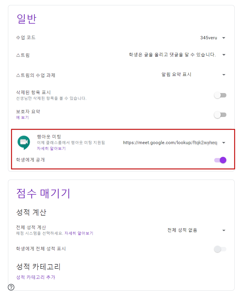 설정으로 진입 후 일반 탭에 행아웃 미팅이 추가된 것을 확인할 수 있다. 학생들에게 공개하면 행아웃 미팅 회의룸이 개설되고 클래스룸과 연결된다.